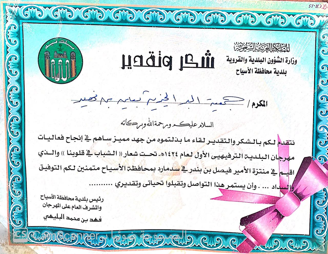 شهادة شكر مقدمة من بلدية الاسياح