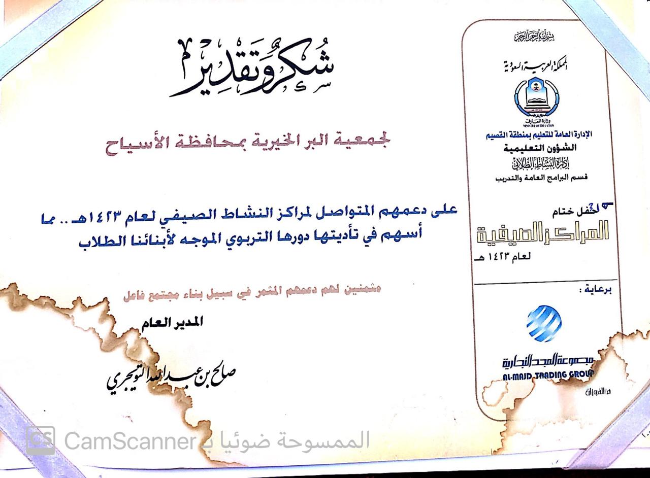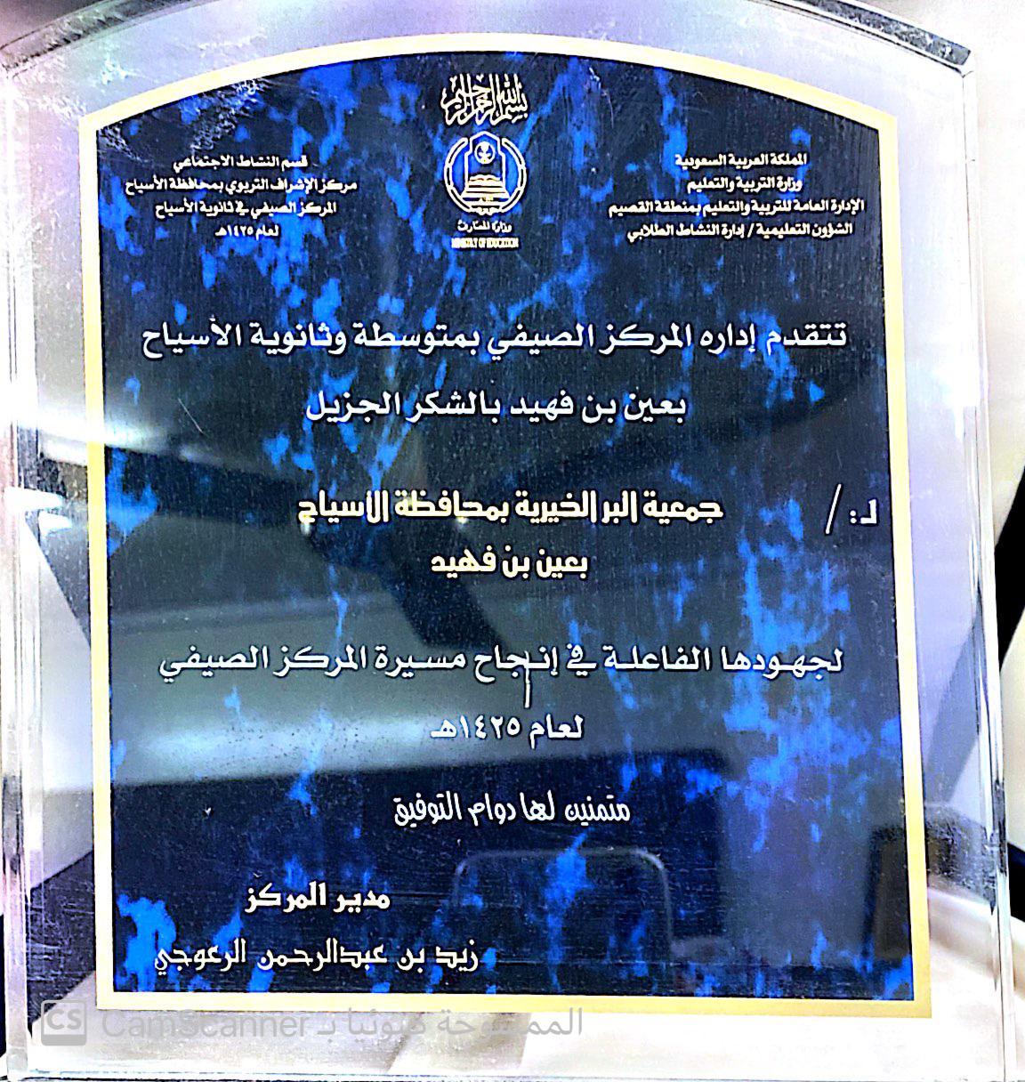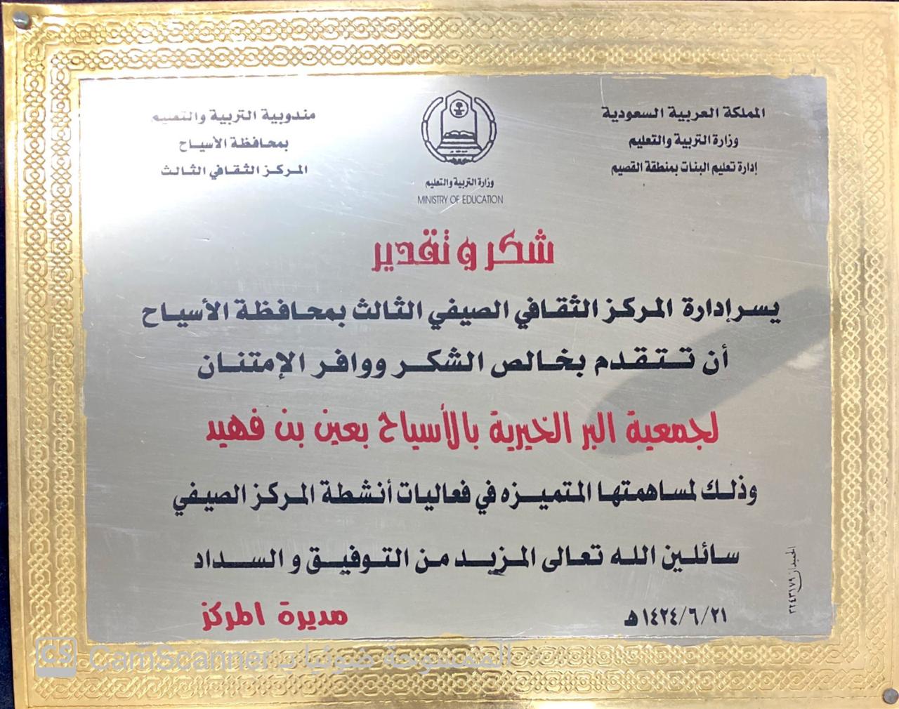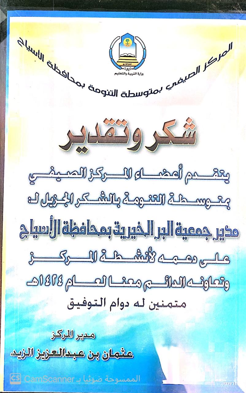 شكر وتقدير مقدمة من المركز الثقافي الصيفي بمحافظة الاسياح