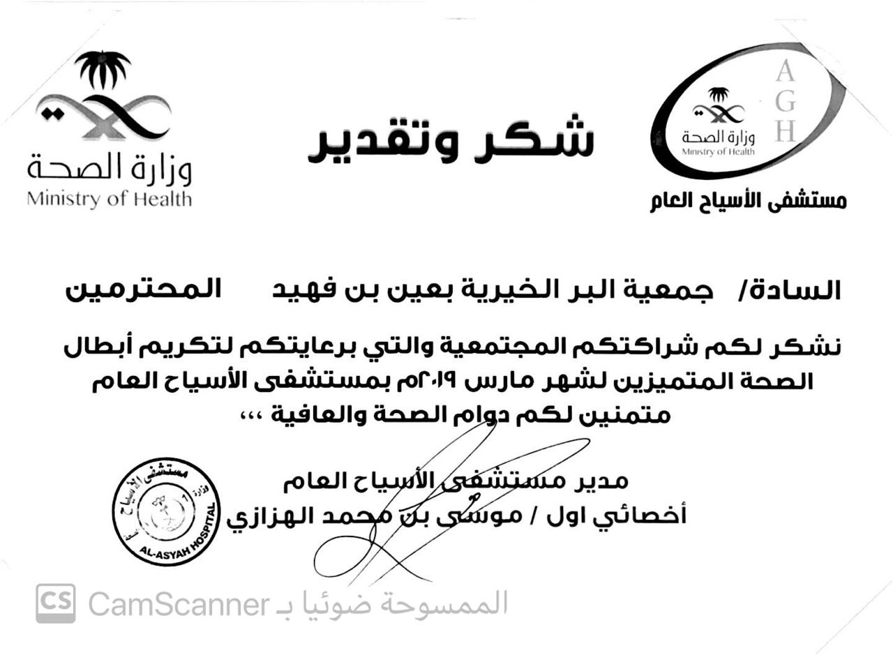 شهادة شكر مقدمة من مستشقى الاسياح