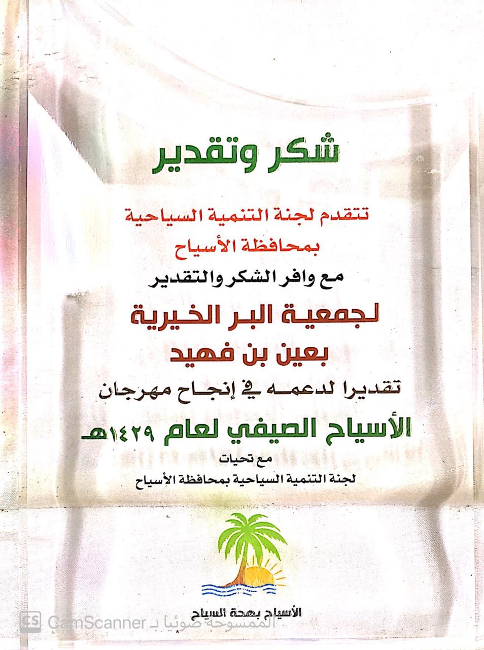شكر وتقدير مقدمة من لجنة التنمية السياحية بمحافظة الاسياح