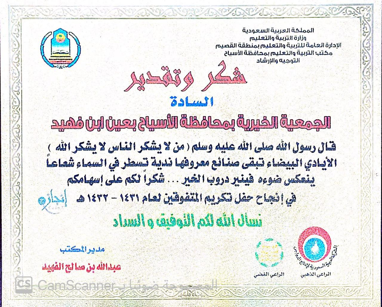 شكر وتقدير مقدمة من وزارة التربية والتعليم بعين بن فهيد