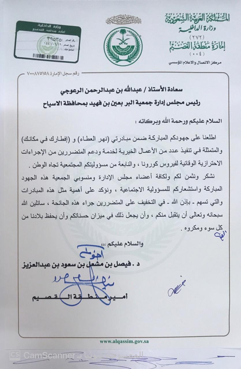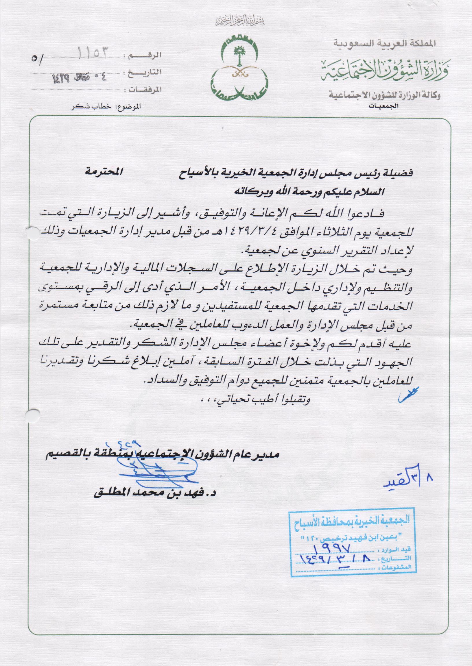 شكر مدير عام الشئون الاجتماعية بمنطقة القصيم للجمعية